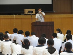 9月14日(月)の7限目 1年生の「有法子」がありました。今回のテーマは「国際」で、西条市役所の産業経済部 観光振興課 国際交流推進室・国際推進係長 友澤宏之 氏の講座でした。西条市における多文化共生のまちづくりについて話してくださいました。「西条市における海外との交流状況」や「イベントへの参加のきっかけづくり」、「新型コロナウィルス感染拡大による影響」等について話してくださいました。